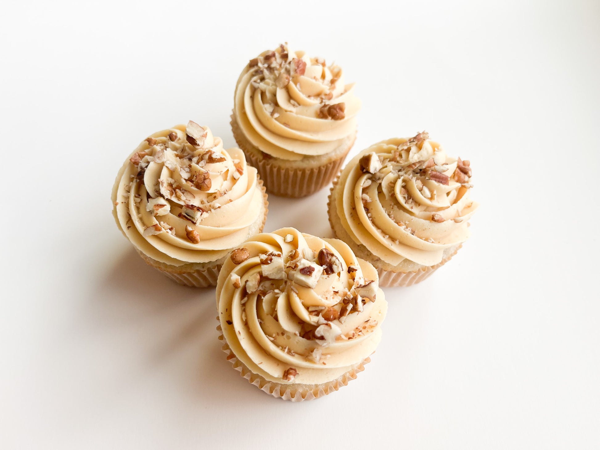6 fluffy gluten free Pecan Pie cupcakes that are filled with chopped pecans and topped with a light brown sugar buttercream icing and more pecans